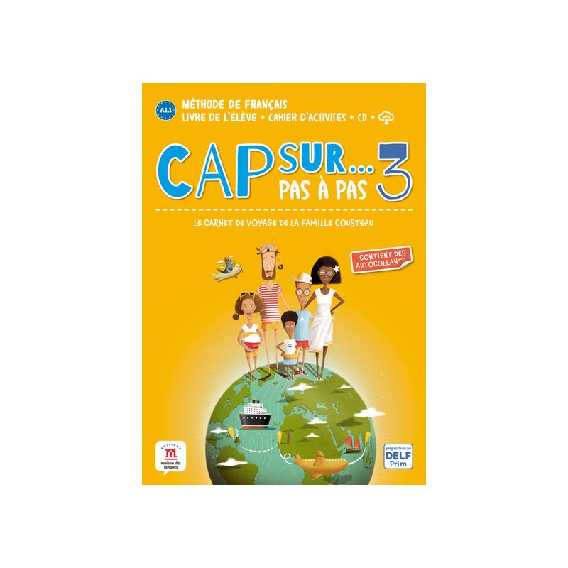 Cap sur...pas à pas est une nouvelle méthode de Français Langue Étrangère pour les enfants. L'élève suit la famille Cousteau qui décide de faire un tour du monde dans des pays francophones. Pendant leur périple qui les emmène depuis Paris vers la Martinique, le Sénégal, le Canada, etc. ils tiennent un carnet de voyage illustré, que les élèves retrouvent dans la méthode.